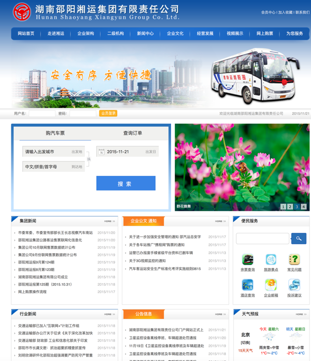 為加強(qiáng)企業(yè)信息化工作,利用網(wǎng)站推廣企業(yè)文化、提升內(nèi)部管理效率,湖南邵陽湘運(yùn)集團(tuán)有限責(zé)任公司官方網(wǎng)站域名www.sdqc1688.com于11月11日通過審核,網(wǎng)站次日正式上線發(fā)布。集團(tuán)公司與旗下客運(yùn)子公司均有獨(dú)立版面,可發(fā)布文件信息、動態(tài)新聞等,今后集團(tuán)公司的公文、通知等將在網(wǎng)上發(fā)布,各子公司在網(wǎng)上查看下載,極大提升了文件發(fā)布的效率。該網(wǎng)站最大的特點(diǎn)是可以查詢邵陽地區(qū)一二級車站所有車輛班次、時間、價格信息,并可在線購票,購票成功后憑密碼或身份證前往車站自動取票機(jī)(或人工售票窗口)取票,該網(wǎng)站為旅客提供了一個便捷的購票渠道。